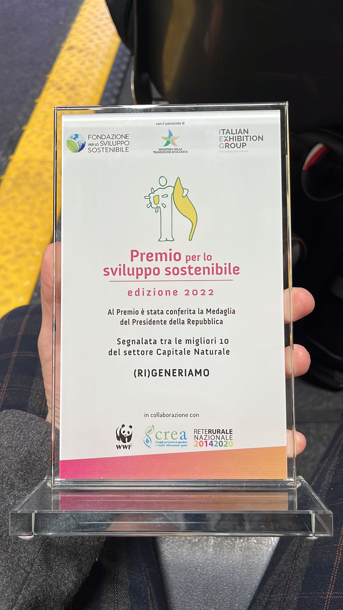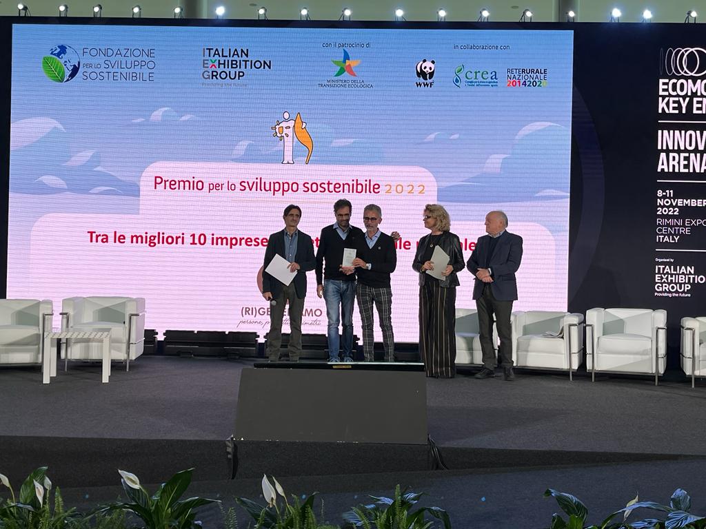In occasione del “Premio per lo sviluppo sostenibile” istituito per il dodicesimo anno dalla Fondazione per lo Sviluppo Sostenibile e dall’Italian Exhibition Group con il patrocinio del MITE, (RI)GENERIAMO è stata inserita tra le miglior realtà nell’ambito “Capitale naturale”, settore del Premio dedicato alle imprese italiane che abbiano realizzato o avviato progetti innovativi come il supporto al capitale naturale.